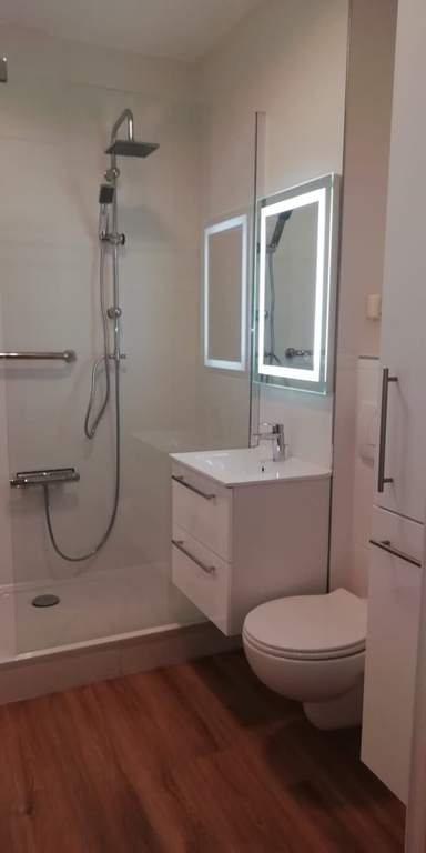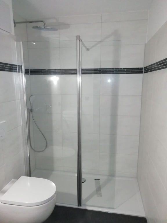 Das gesamte Bad wurde neu gefliest, eine Duschwanne wurde eingebaut, das WC gewechselt und ein Waschbecken mit Unterschrank kam neu hinzu. Alle Arbeiten wurden sehr sorgfältig in hoher Qualität erledigt. Besonderen Wert legte das Unternehmen auch auf die Sauberkeit in den übrigen Räumen. So hielt sich hier die Verunreinigung mit dem kaum vermeidbaren Staub in Grenzen. Zum Feierabend wurde stets gründlich aufgeräumt. Notwendige Toilettengänge wurden problemlos ermöglicht, erforderliches Abstellen des Wassers erfolgte stets nach Absprache und wurde möglichst kurz gehalten.
